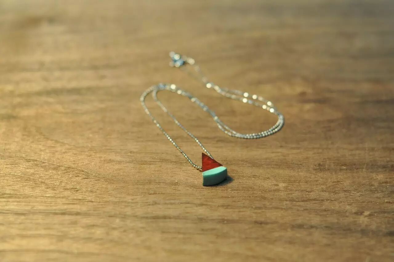 小西瓜是我原来的学生,喜欢画板画,当过学校文学社的社长,是个很有才气的女生。高三那年大家都忙得焦头烂额,她决定出国,比别人悠闲不少,于是成了我的首席设计师。那段时间,我们一起设计、制作了许多饰品。毕业后她去了美国读大学,因为课业繁忙,她不再帮我设计饰品,我们联系的也渐渐少了。不久前她回国又来学校看我,我就做了这个小西瓜的项链送给她,陪着她回美国。做喜欢的人所喜欢的元素是一件很有意思的事情,把抽象的感觉具体化的过程,也带给我很多的灵感。