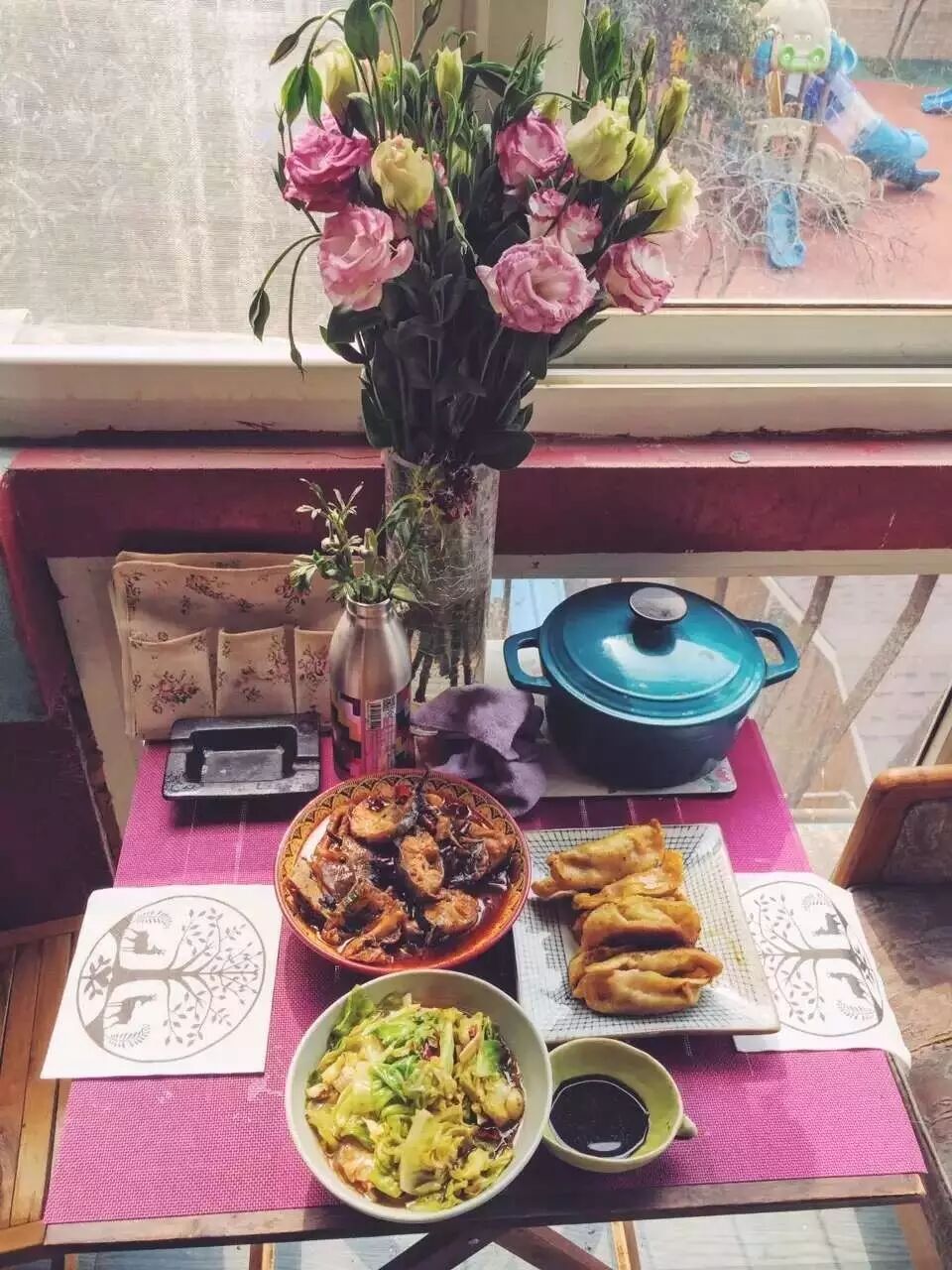 我的厨房总是堆满了各种调料,各个菜出锅时,脏乱差的场景,总让人觉得食品卫生这关可能过不了。可还是愉悦的,秋天做饭的时候,站在厨房都可以闻到外面的桂花香。如果吃完有人可以负责洗碗,就更加皆大欢喜了。